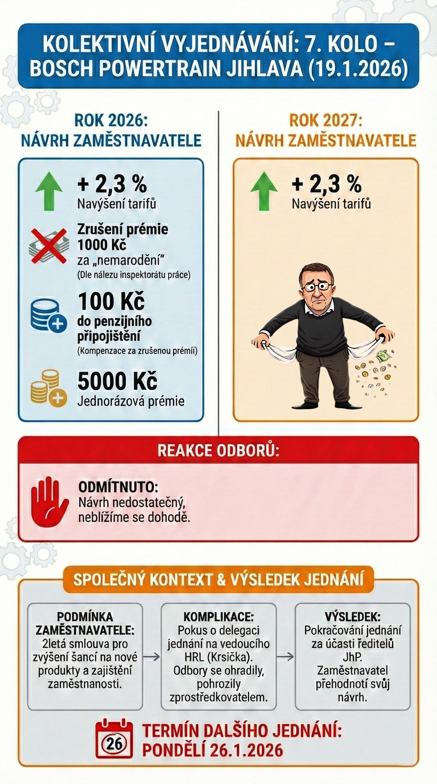 Dne 19. ledna 2026 proběhlo 7. kolo kolektivního vyjednávání mezi zástupci odborových organizací a vedením společnosti Bosch Powertrain Jihlava