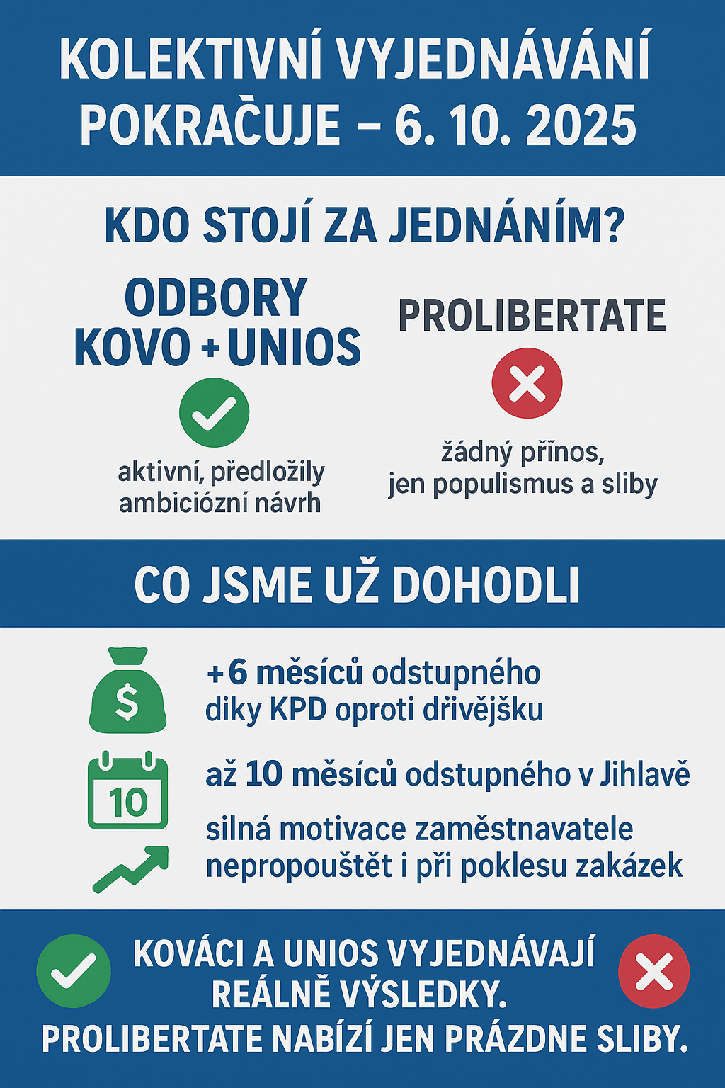 K návrhům odborů KOVO a Unios se připojilo i Prolibertate, které v emailu na vedení JhP podpořilo náš návrh do KV, takže již nic nebrání k pokračování Kolektivního vyjednávání, které se uskuteční 6.10. 2025.