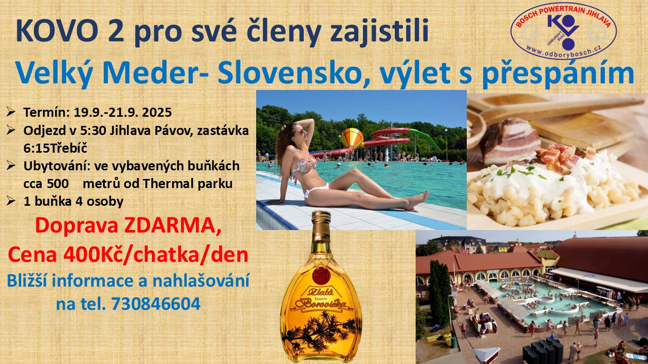 Připomínáme výlet do Velkého Mederu již příští týden Ješte jsou volné chatky. Cena je. 400 Kč za chatku na noc. Doprava zdarma.